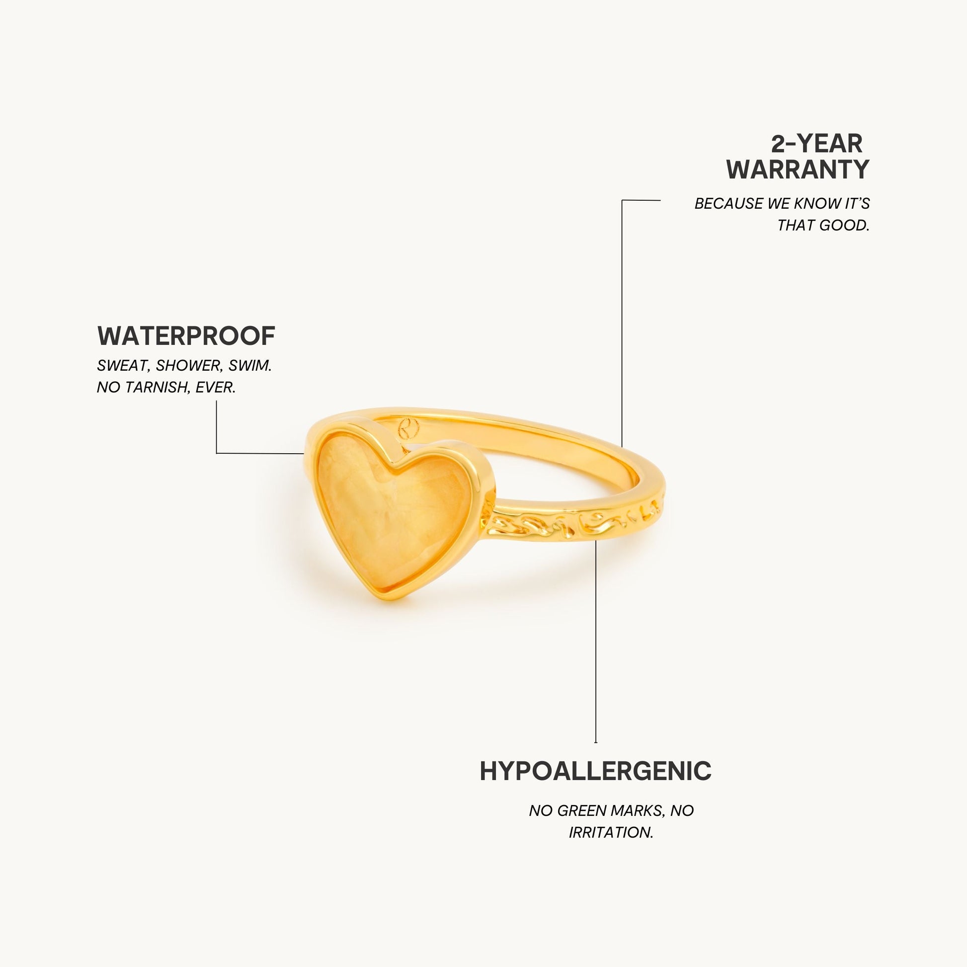 Premium rustfrit stål er 100 % vand-, sved- og varmebestandigt. Det betyder, at du selv med følsom hud kan fuldende dit look uden bekymring.