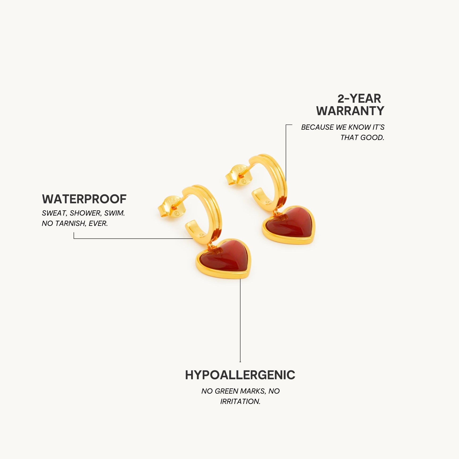 Premium rustfrit stål er 100 % vand-, sved- og varmebestandigt. Det betyder, at du selv med følsom hud kan fuldende dit look uden bekymring.