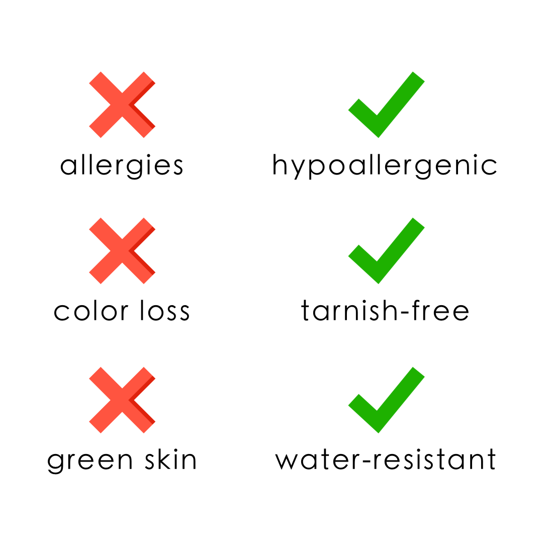 Premium rustfrit stål er 100 % vand-, sved- og varmebestandigt. Det betyder, at du selv med følsom hud kan fuldende dit look uden bekymring.