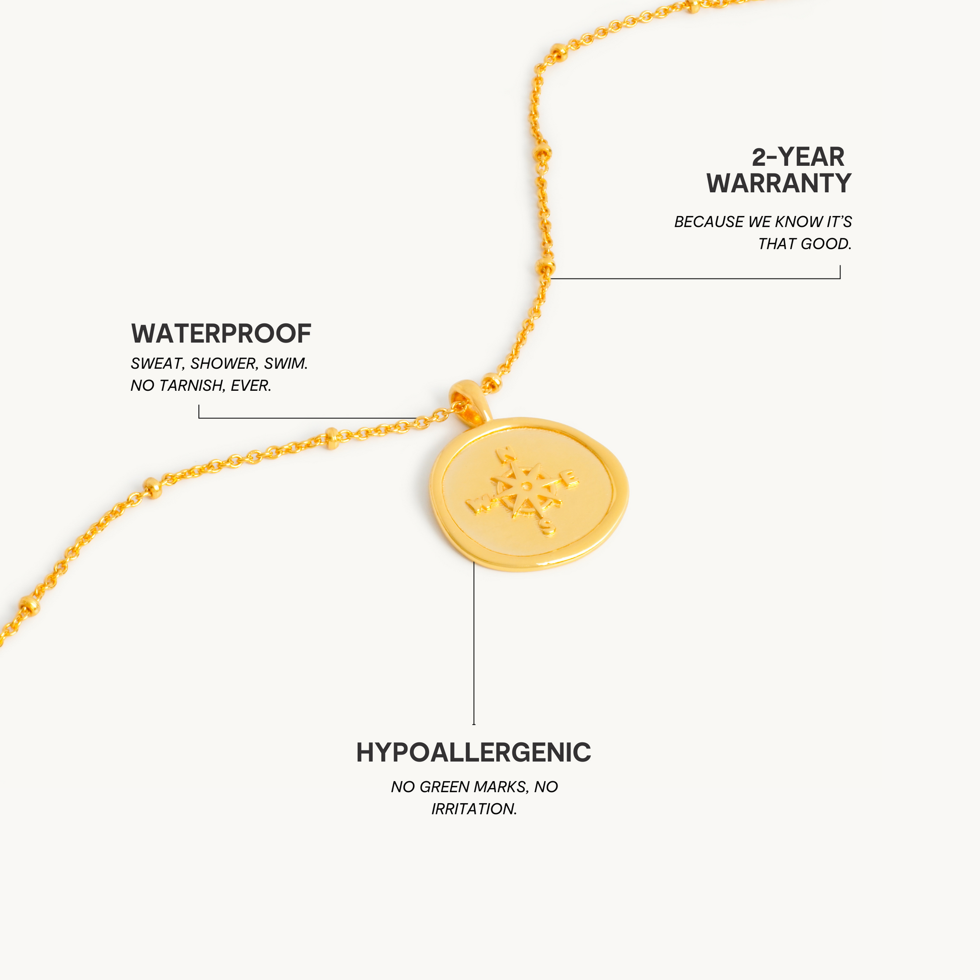 Vores smykker er fremstillet af rustfrit stål af høj kvalitet og derefter belagt med 18 karat guld via Physical Vapor Deposition (PVD).