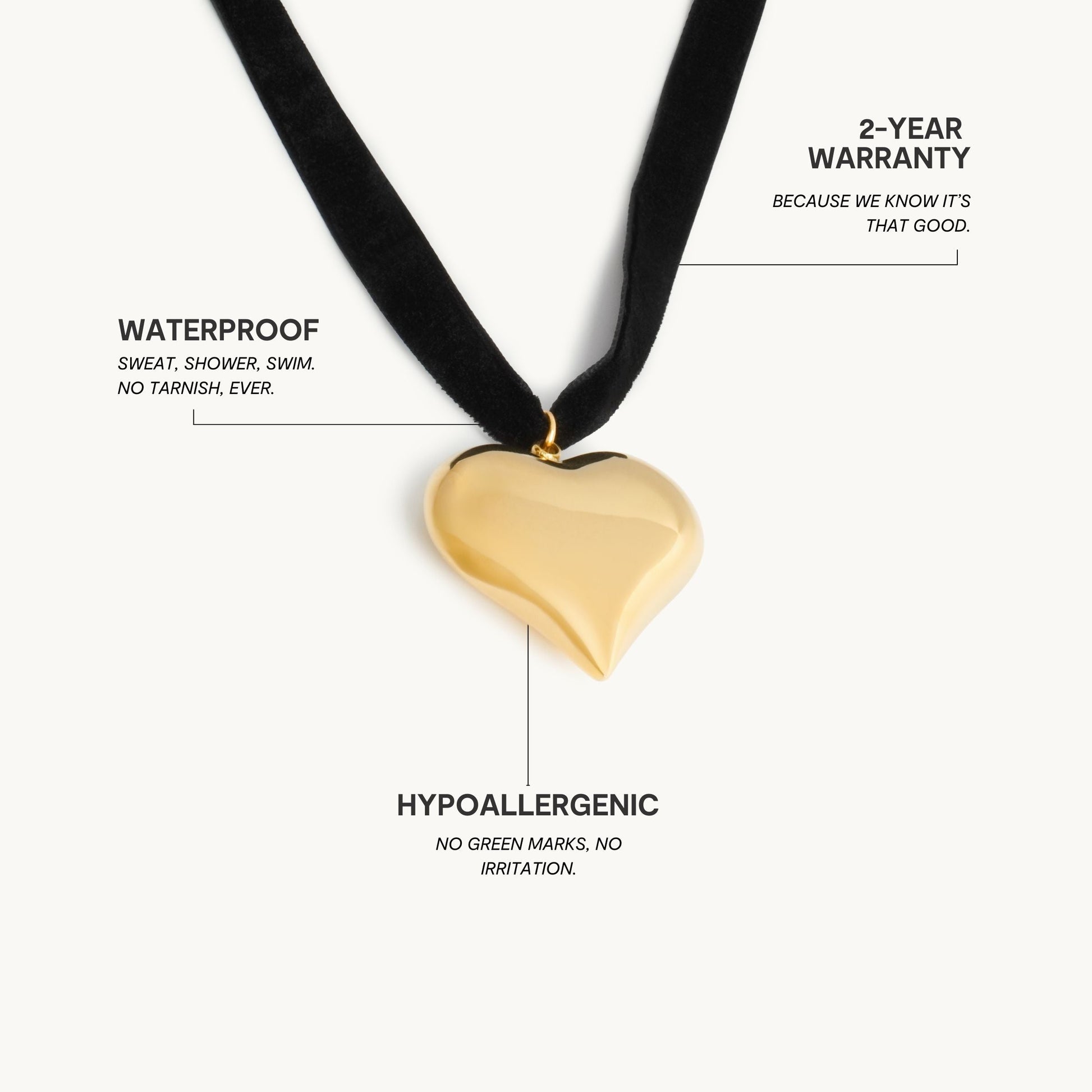 Premium rustfrit stål er 100 % vand-, sved- og varmebestandigt. Det betyder, at du selv med følsom hud kan fuldende dit look uden bekymring.