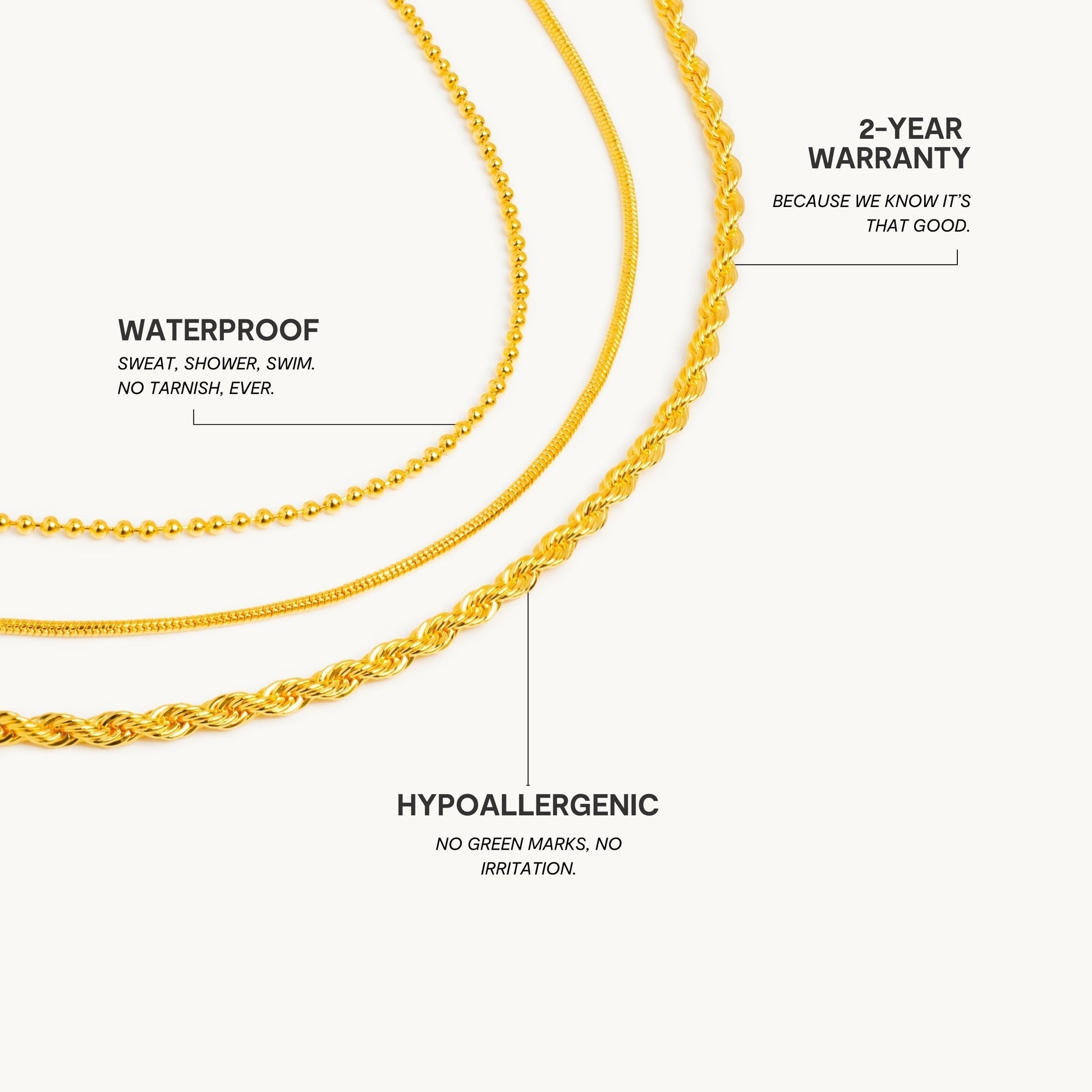 Vores smykker er fremstillet af rustfrit stål af høj kvalitet og derefter belagt med 18 karat guld via Physical Vapor Deposition (PVD).