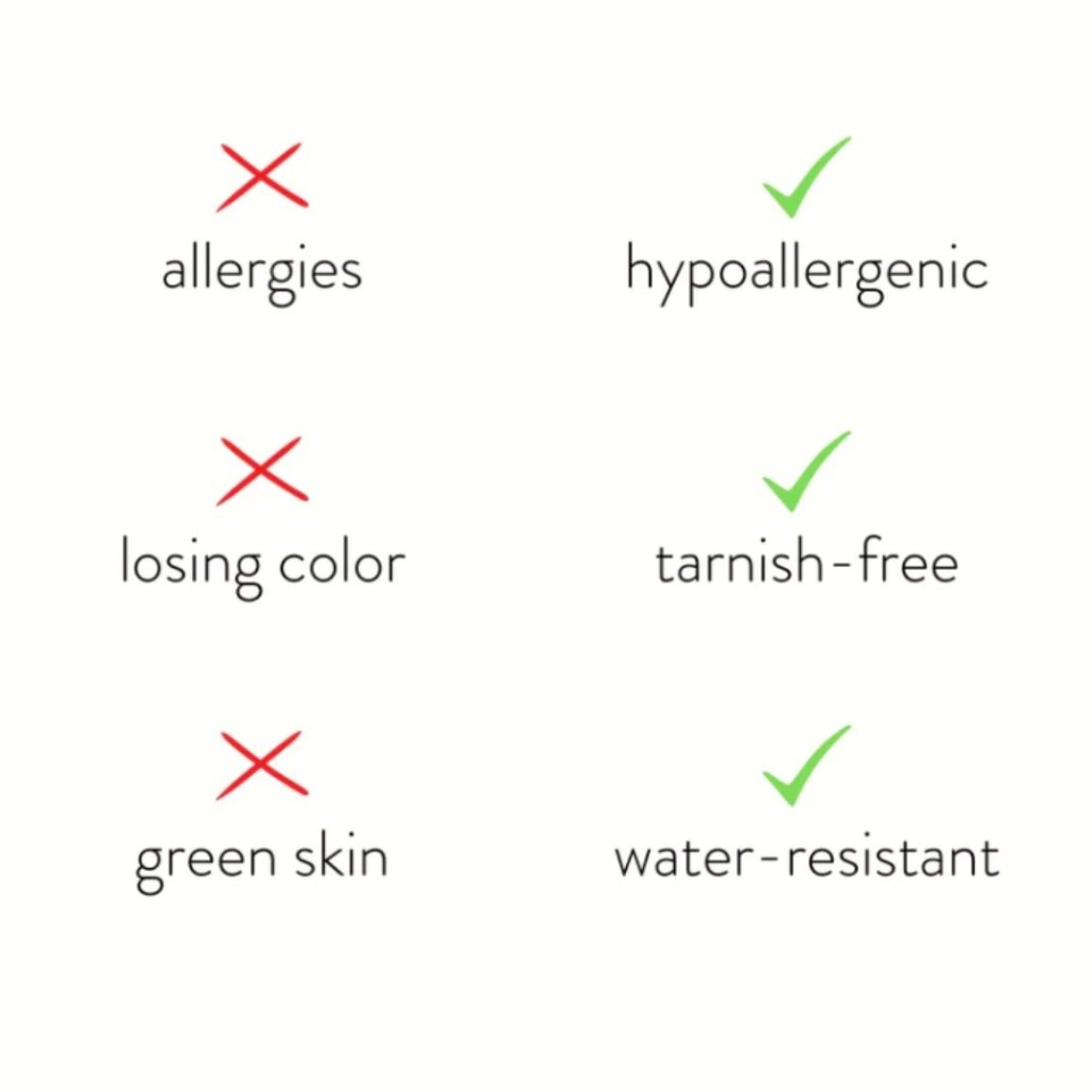 Premium rustfrit stål er 100 % vand-, sved- og varmebestandigt. Det betyder, at du selv med følsom hud kan fuldende dit look uden bekymring.