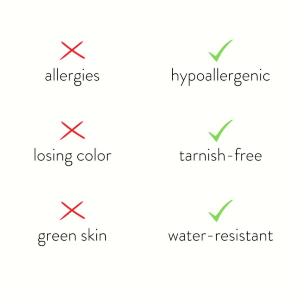 Premium rustfrit stål er 100 % vand-, sved- og varmebestandigt. Det betyder, at du selv med følsom hud kan fuldende dit look uden bekymring.