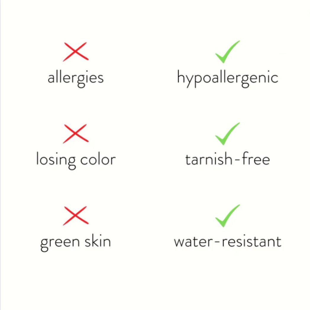 Premium rustfrit stål er 100 % vand-, sved- og varmebestandigt. Det betyder, at du selv med følsom hud kan fuldende dit look uden bekymring.