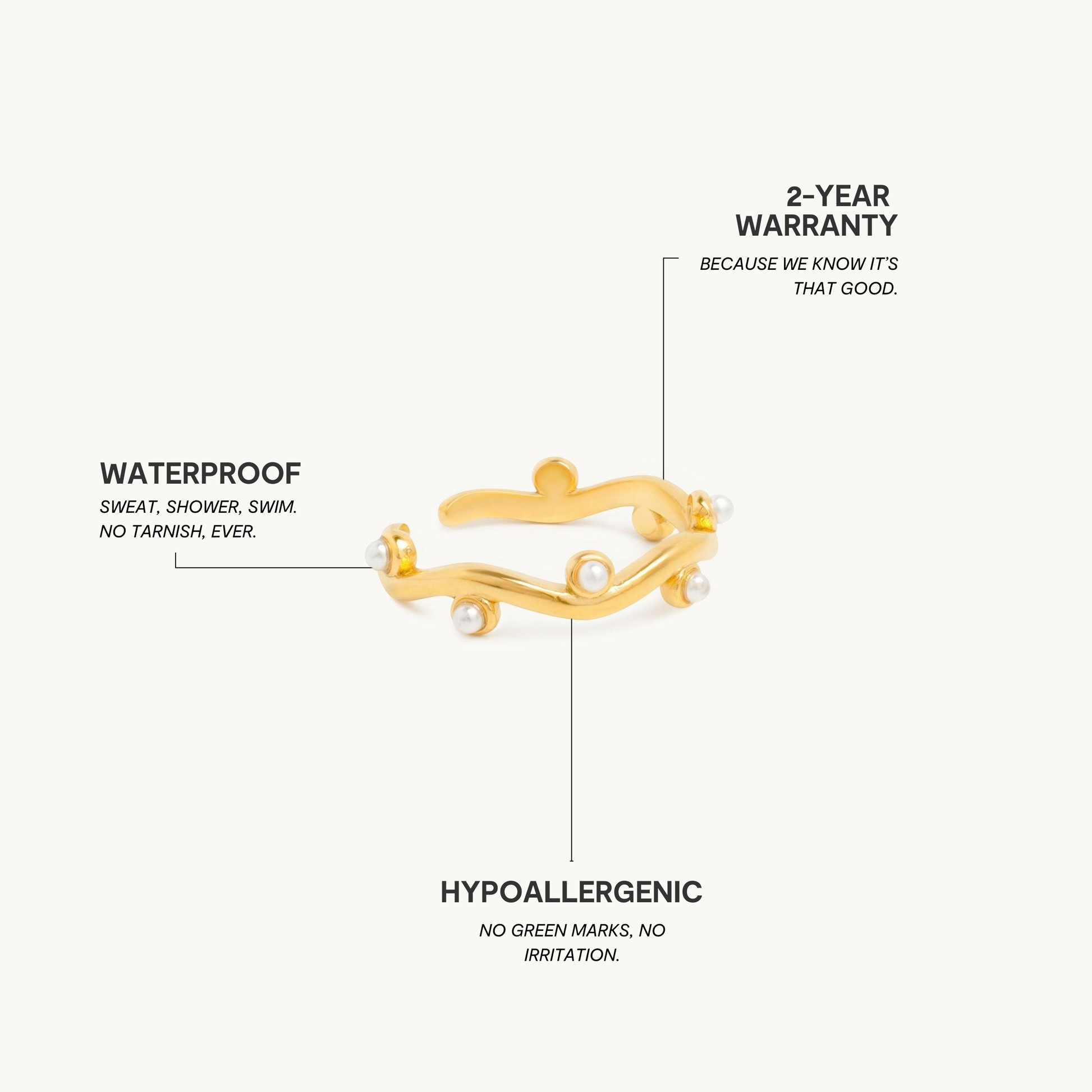 Premium rustfrit stål er 100 % vand-, sved- og varmebestandigt. Det betyder, at du selv med følsom hud kan fuldende dit look uden bekymring.