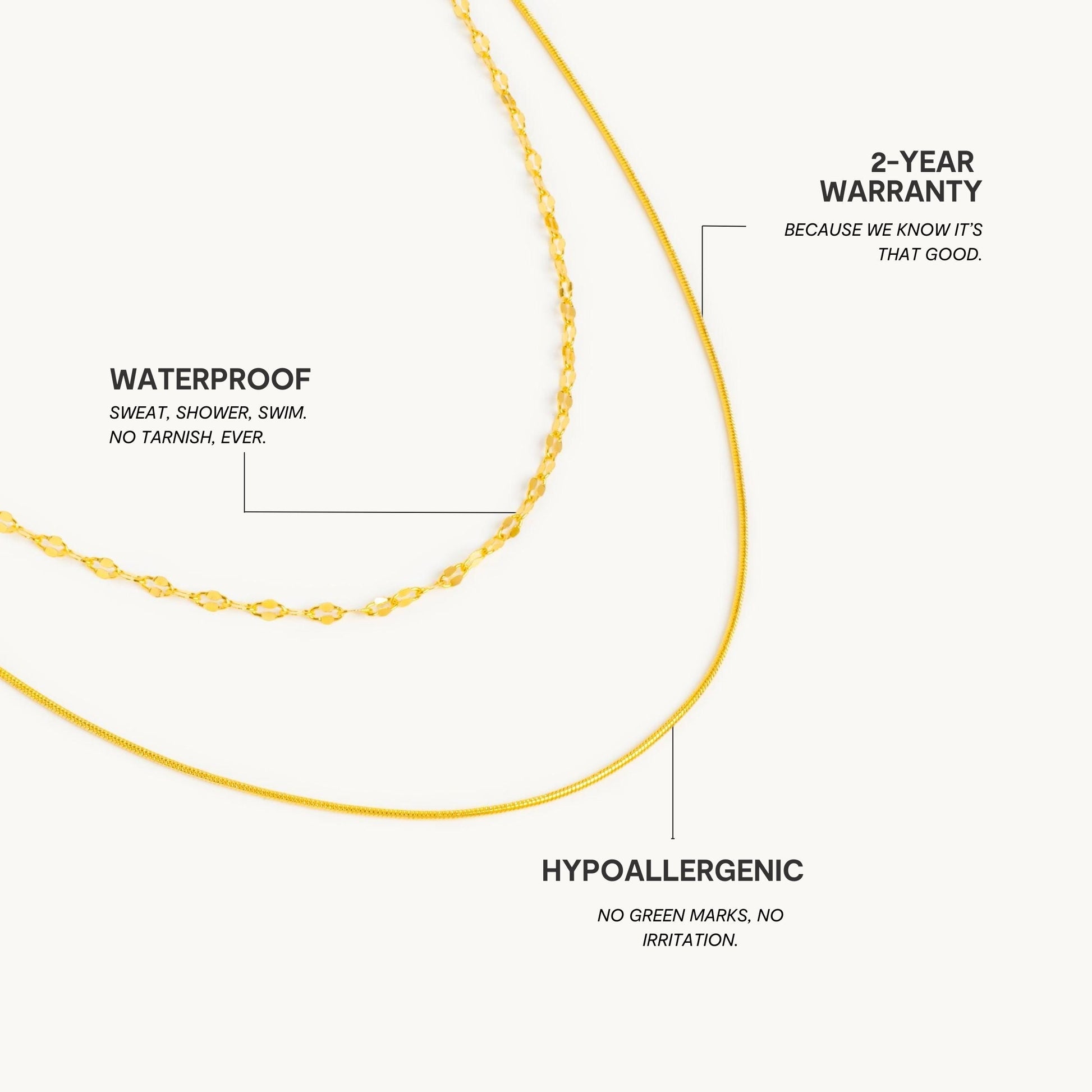 Vores smykker er designet til at følge med din aktive livsstil. Vandtæt, saltvandsresistent og svedtæt, hver enkelt del bevarer sin glans, uanset hvor din dag tager dig hen – fra stranden til fitnesscentret og videre.