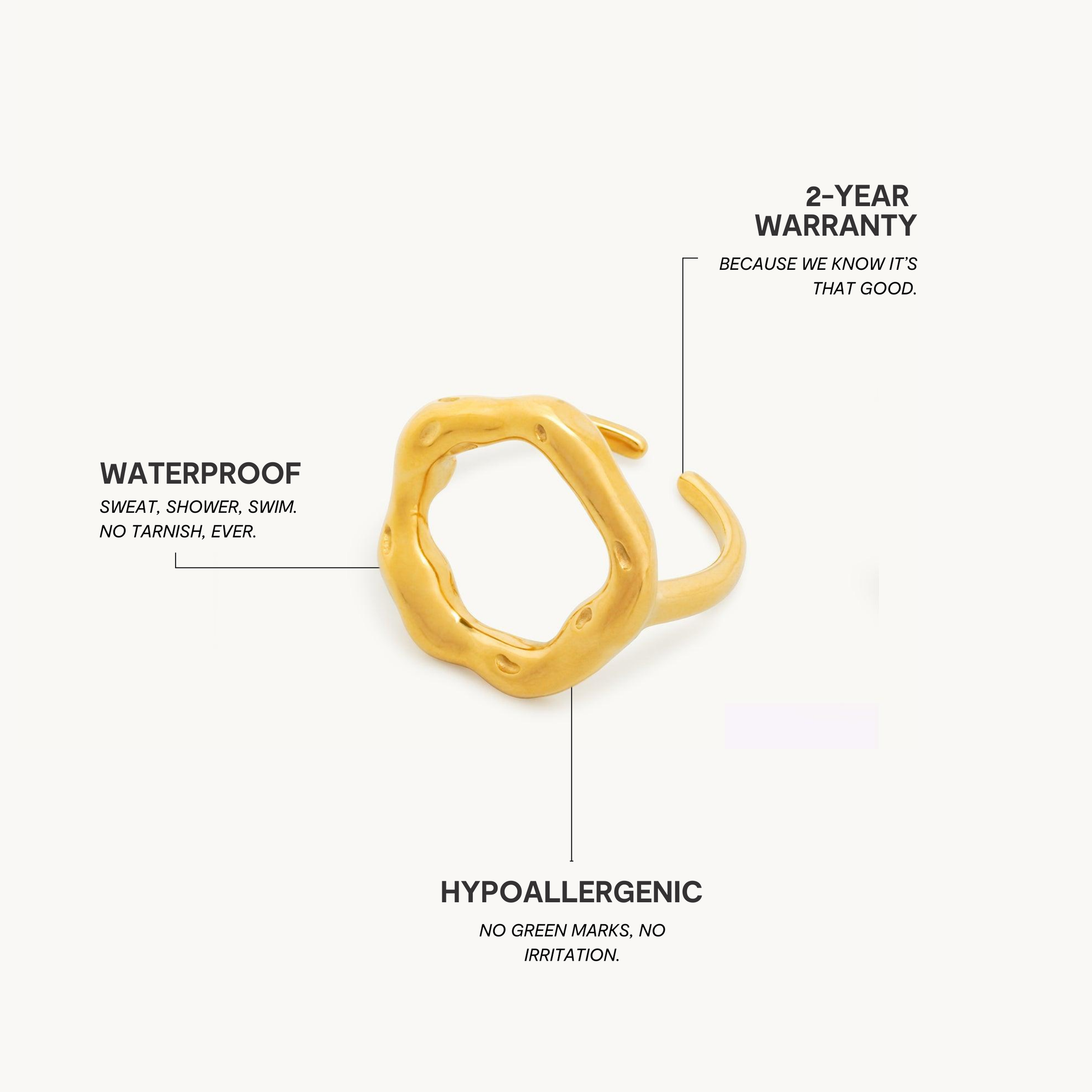 Premium rustfrit stål er 100 % vand-, sved- og varmebestandigt. Det betyder, at du selv med følsom hud kan fuldende dit look uden bekymring.