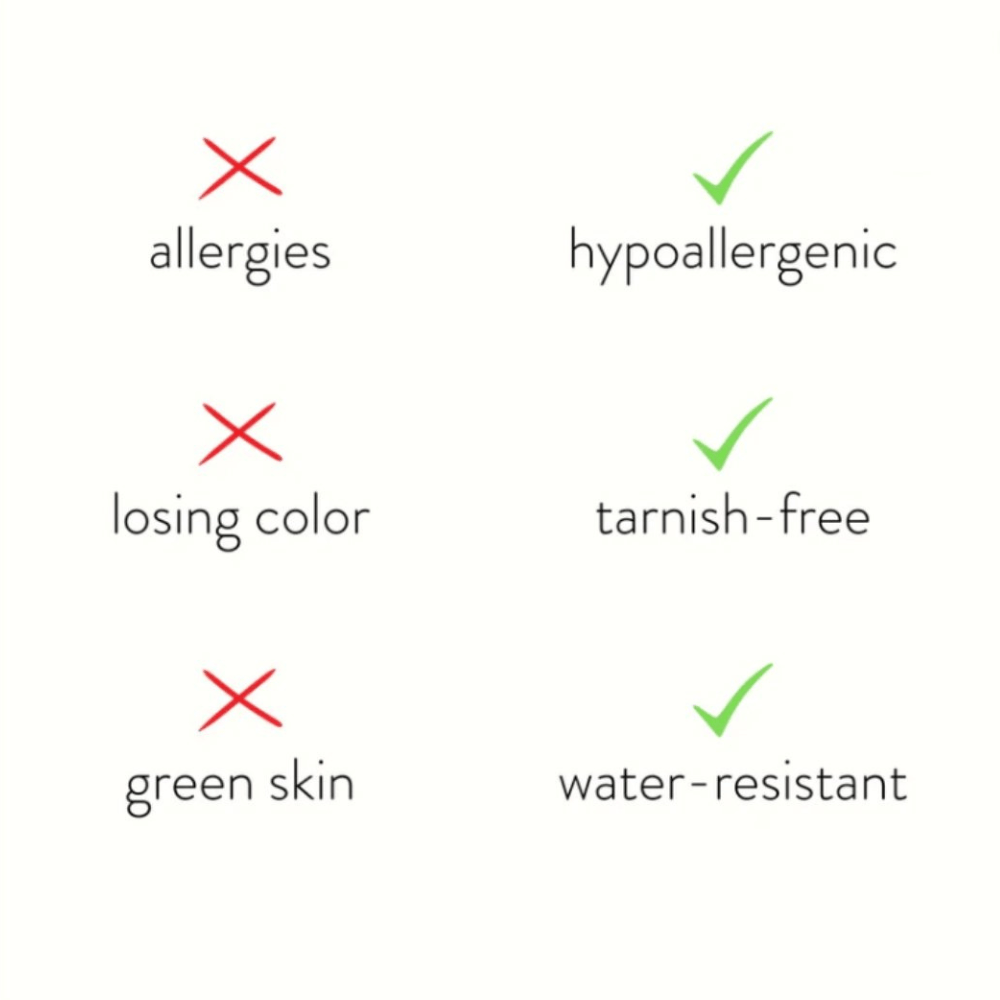 Premium rustfrit stål er 100 % vand-, sved- og varmebestandigt. Det betyder, at du selv med følsom hud kan fuldende dit look uden bekymring.
