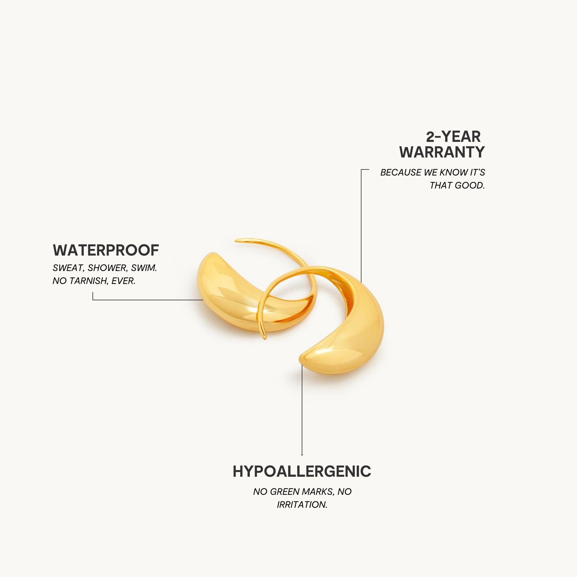 Premium rustfrit stål er 100 % vand-, sved- og varmebestandigt. Det betyder, at du selv med følsom hud kan fuldende dit look uden bekymring.